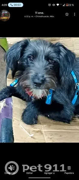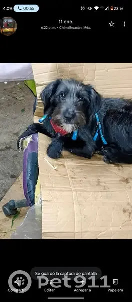 Chipu tiene una barbita blanca, tiene una patita delantera casi sin pelo, tiene tics que le dejo su enfermedad de MOQUILLO una señora lo resguardado por una noche sus vecinos nos dijieron q cuando supo q lo estábamos buscando lo hecho ala calle en la Av de la 27 por piedras negras