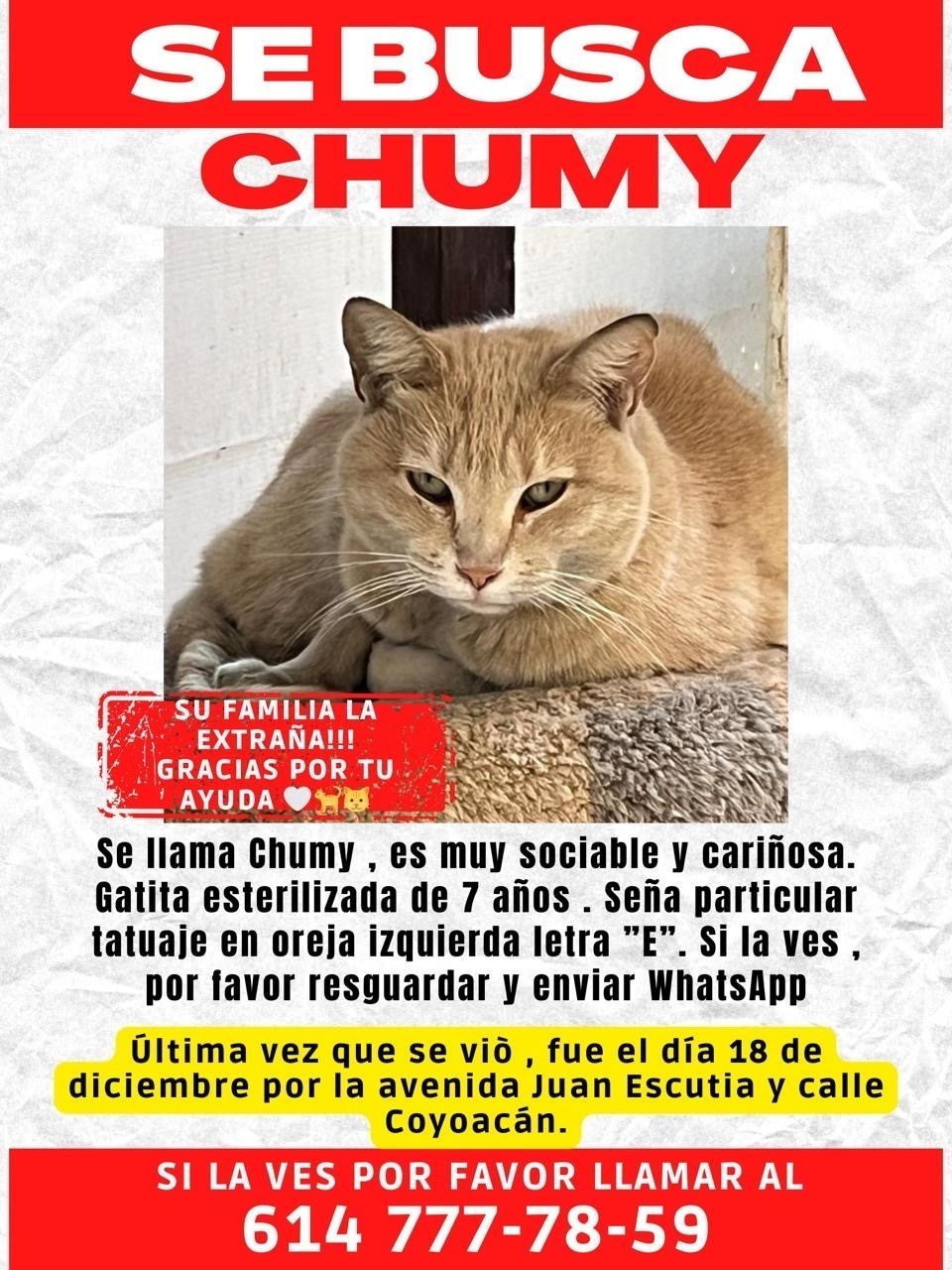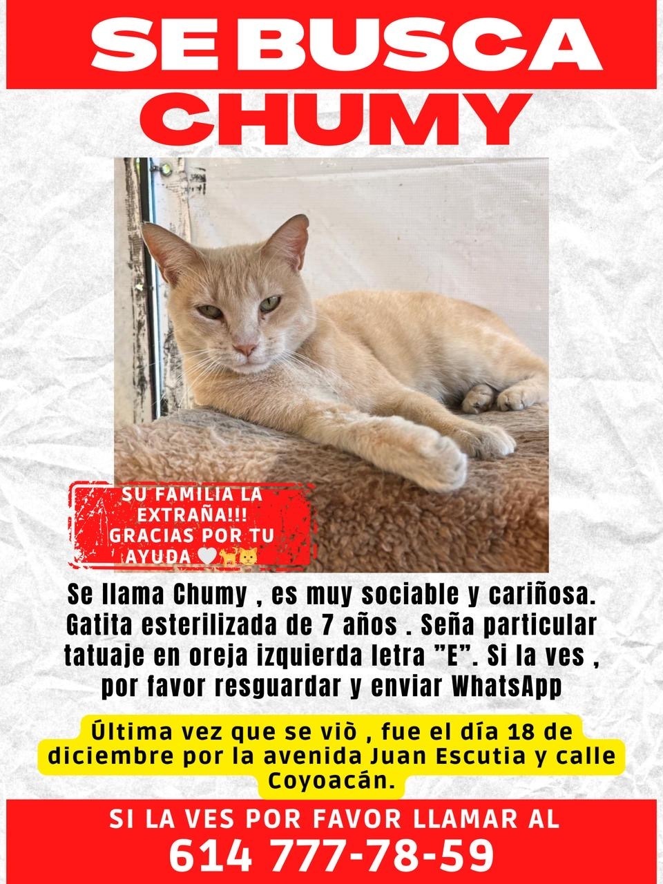Color amarillo paja, tiene un tatuaje en la oreja izquierda de la letra “E”. Responde al nombre de Chumy. Tiene 7 años. Se impermeabilizo la casa y hubo trabajadores entrando y saliendo de la propiedad y fue un factor de stress para la gatita . Es un gato muy sociable y cariñoso.