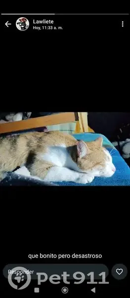 Actuación:Lo encontramos gracias a Dios estaba lastimado y cansado de correr no sabemos si fue correteado por perros y gatos que lo lastimaron pero está todo bien con el chiquito ya lo bañamos y le dimos de comer estaba flaquito ya Muchas gracias por todo ......... Es un gato color naranja con blanco, su cola es nillada, tiene un año lo cumplió el 20 de febrero, está gordito porque come mucho, maulla mucho y su maullido es un poco agudo, responde a su nombre o también con gordo sus patitas de abajo no se ensuciab tan fácilmente ni su pelaje blanco es muy asustadiso pero cariñoso, mi abuela dejo la ventana abierta y se fue y no a vuelto