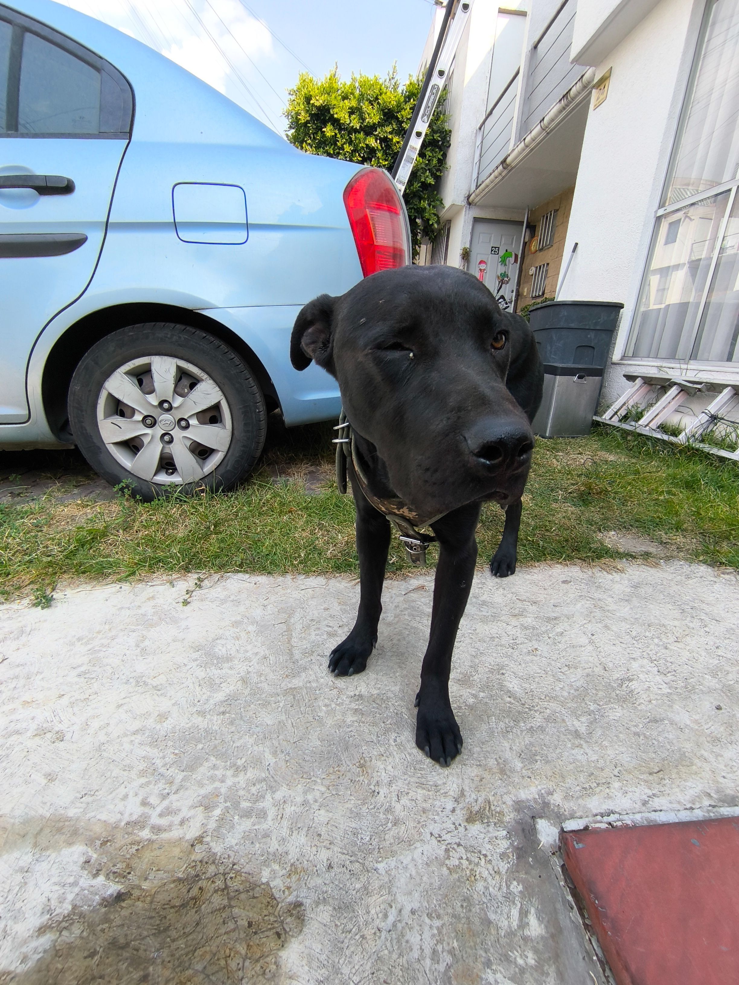 Cruza labrador negro, macho, con arnés tipo camuflaje. Se acerca a los autos tipo sedán y sube sus patas en la ventana del conductor. Come croquetas. No trae collar ni placa pero está acostumbrado a entrar a la casa.