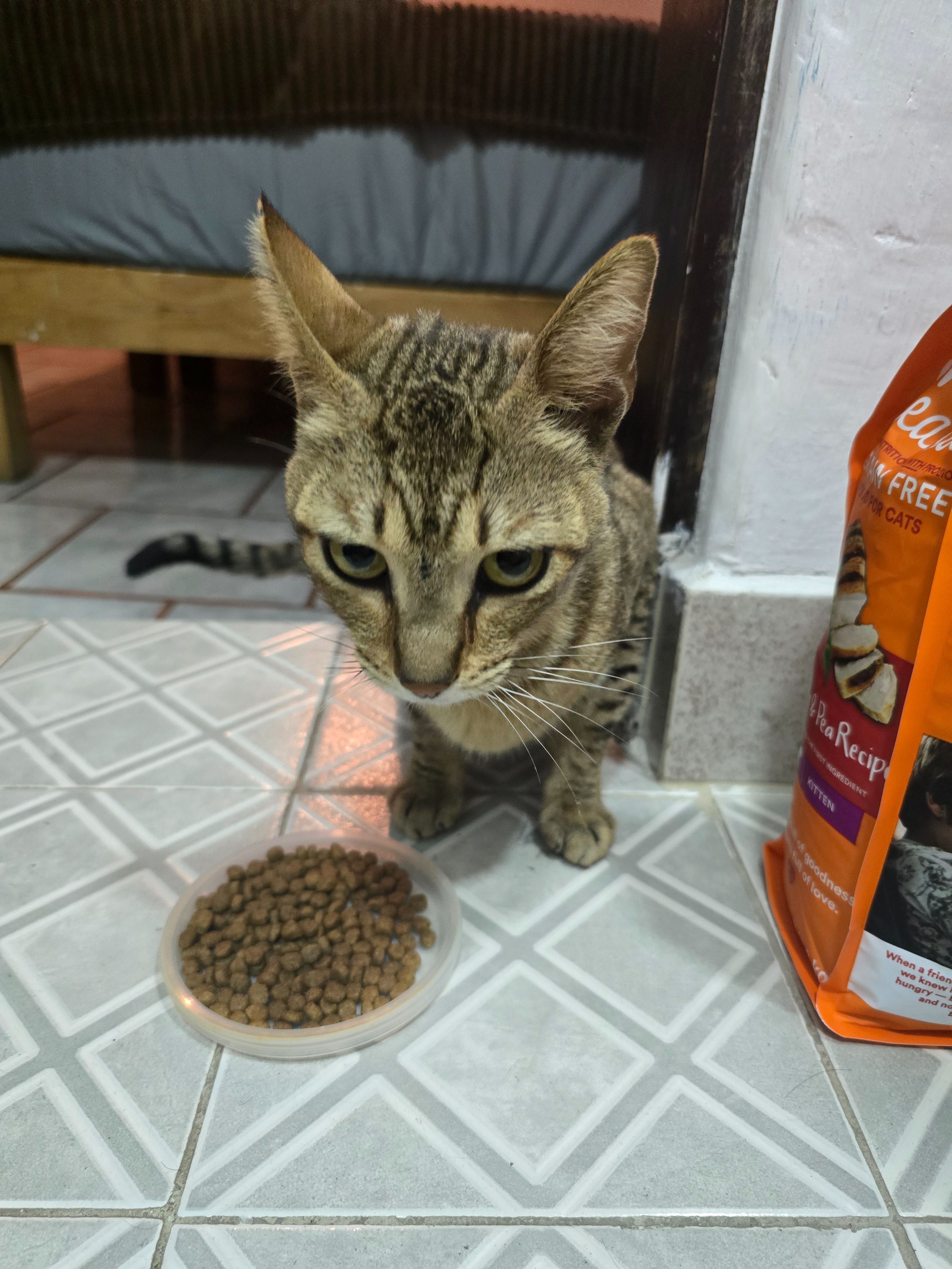 Pelaje atigrado con manchas circulares, se encontró en un consultorio médico en el techo, tenía 3 días sin poder bajar y esta muy delgado, maulla como gato pequeño y es muy dócil.