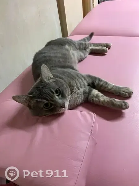 Color gris claro, rayas grises mas oscuras, ojos verdes, traía puesto un collar azulito con un peluchito que resalta en su collar