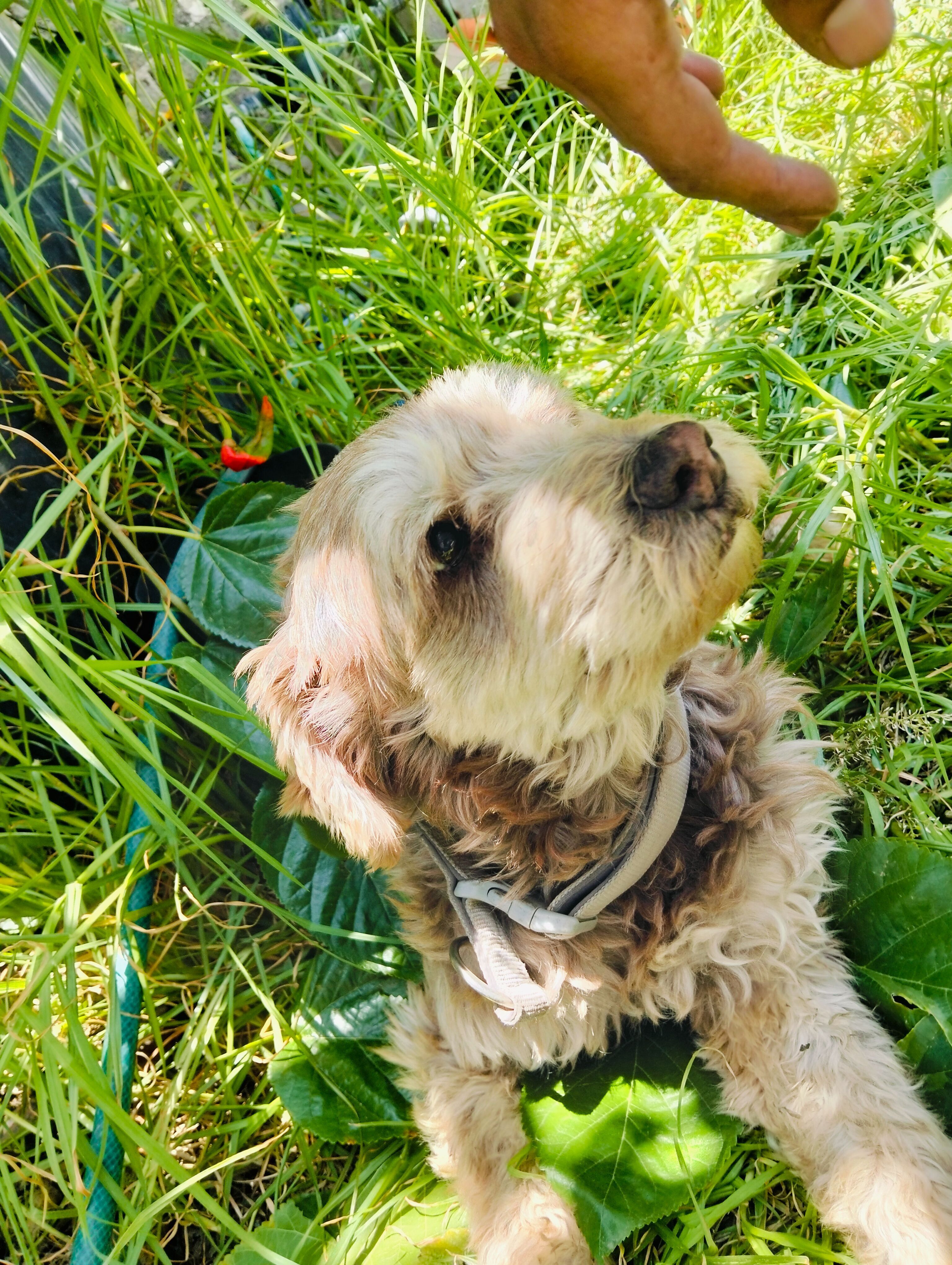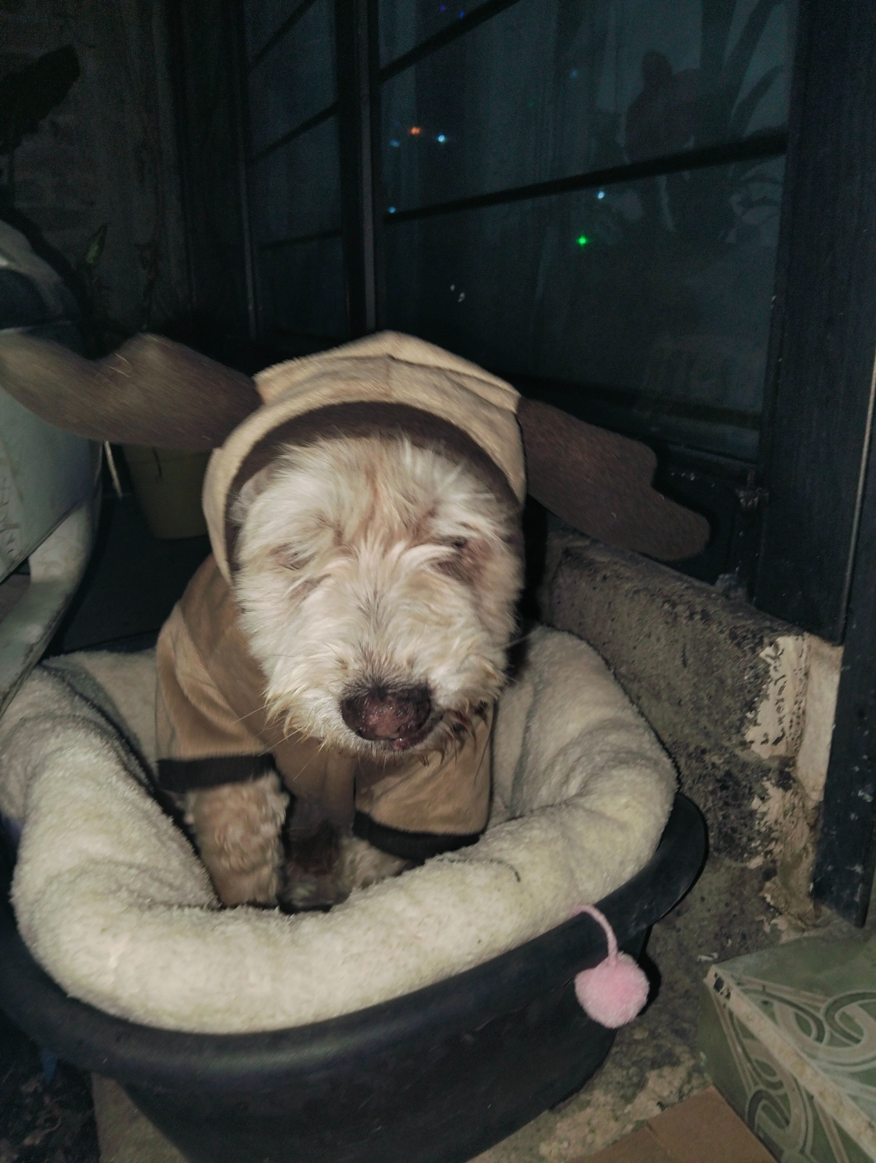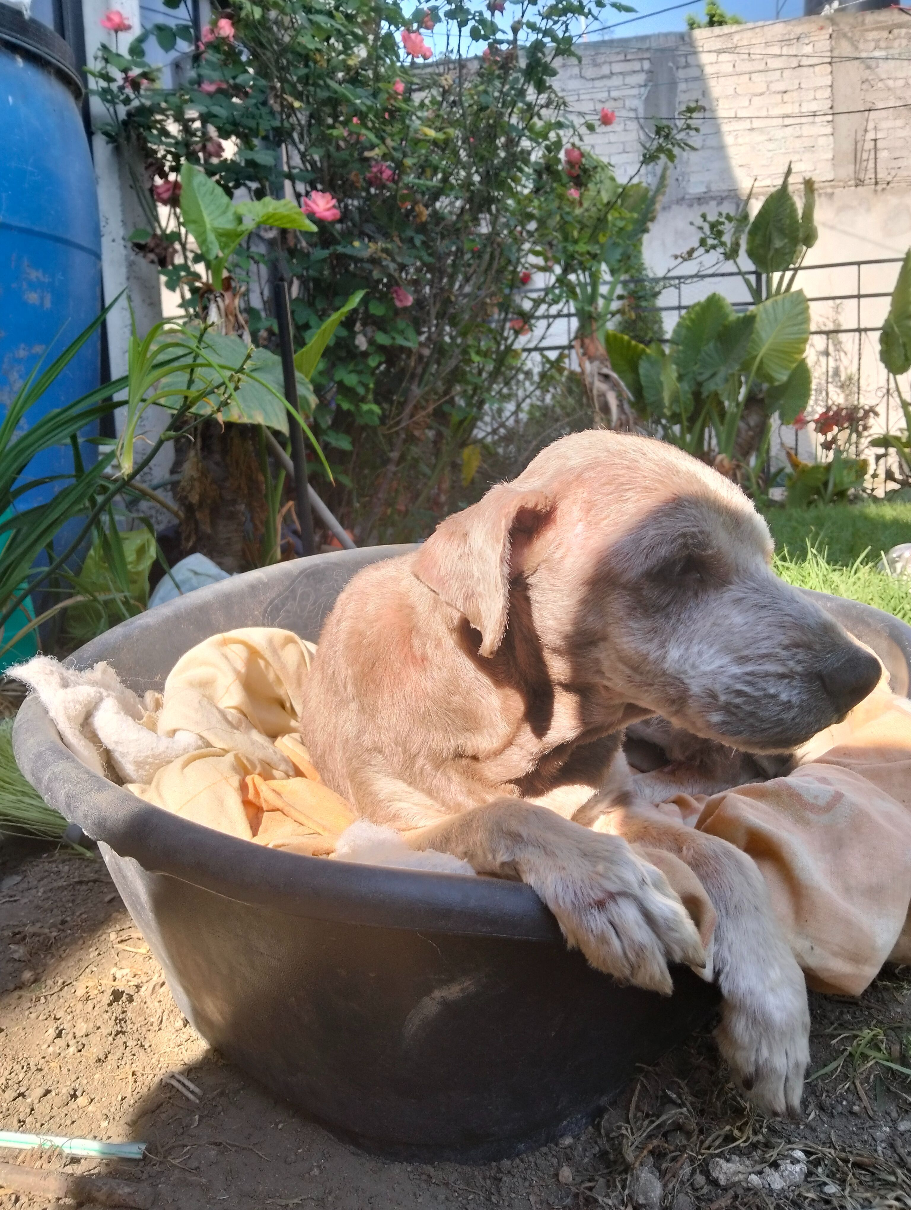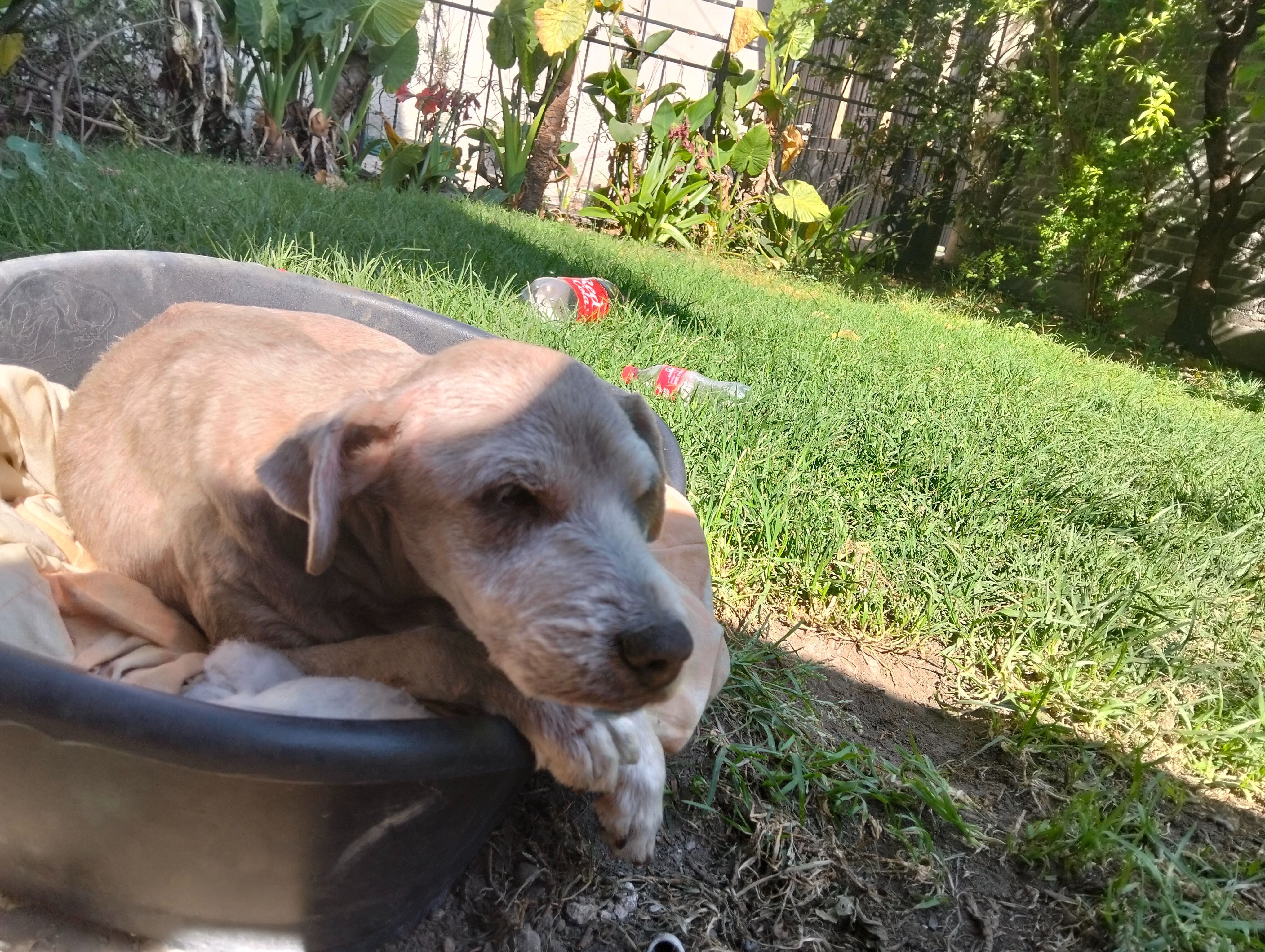 Es café con blanco, tiene una cicatriz en su patita trasera derecha, complexión mediana , es cruza, su colita en la puta es corta pero con pelo, casi no tiene dientes, si nariz es café con una manchita rosa. Desaparecio el día sábado en un descuido cuando entregaron el agua, ya está viejita por lo que escucha poco y no camina mucho.