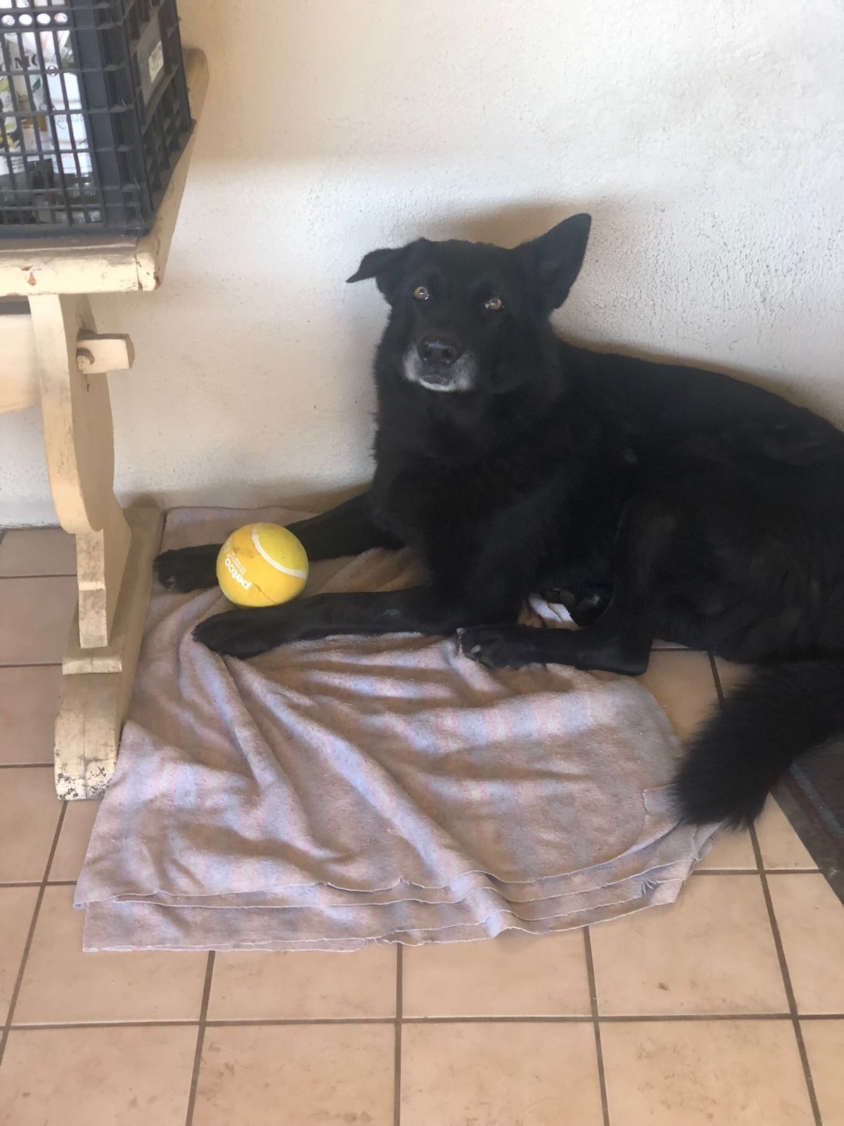 Perro grande Pastor Aleman color Negro con ya canas en su hocico, nunca se habia salido de casa pero creemos que salio al momento de que pasaran unos perros callejeros. No es bravo pero si puede llegar a morder porque no es amigable con gente desconocida. No sabe andar en calle asi que estara muy miedoso y desorientado