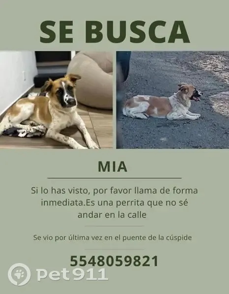 No sabe andar solo en la calle, es muy dócil. La última notificación nos mencionaron que la vieron cruzando en puente peatonal cerca del centro comercial La Cúspide. Muchas gracias