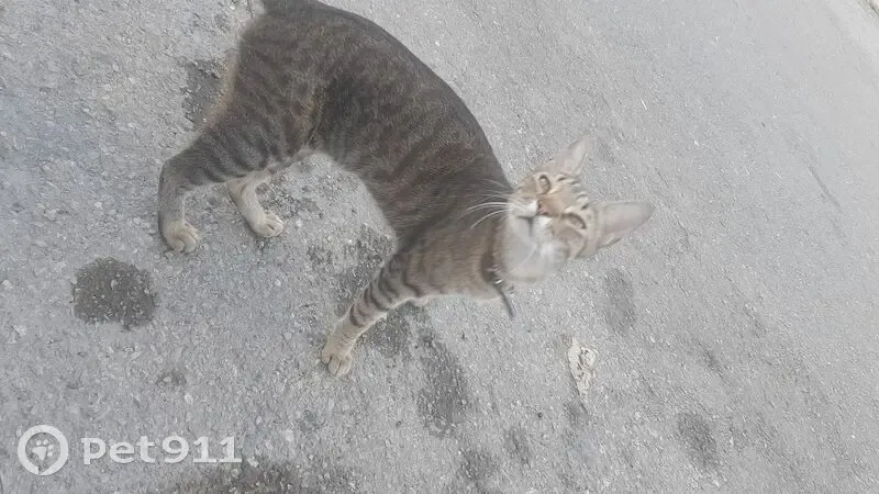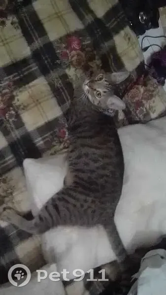 Tabby de pelaje verdoso (mezcla de negro, crema, café y gris) con la punta de la cola enroscada, ojos verdiamarillos, flaco con pañoleta negra atada al cuello mediante collar, igualmente negro. Se escapó de casa por la ventana. Estaba acostumbrado a salir antes de que lo adoptara el año pasado, así que sabe un poco andar en la calle