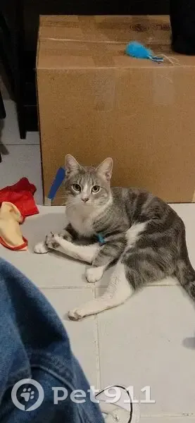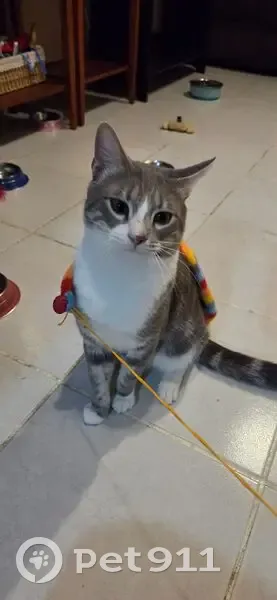 Gatito atigrado gris con blanco. Tiene la mitad de su naricita gris y cafecito. Tiene 1 año y medio de edad. No esta esterilizado aun ya que esta en tratamiento para descartar asma. Se escapo de casa sin darnos cuenta por lo que creemos fue la ventana del baño. Responde al nombre de Felipe, es de tamaño mediano/pequeño y delgado.