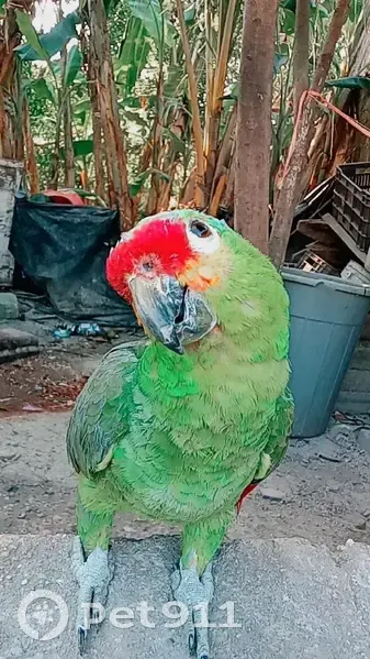 Su cuerpo es verde sus alas son de colores sus patas grises su pico tiene un poco de café con negro su frente roja alado de su pico tiene amarillo Selo robaron mientras yo dormía