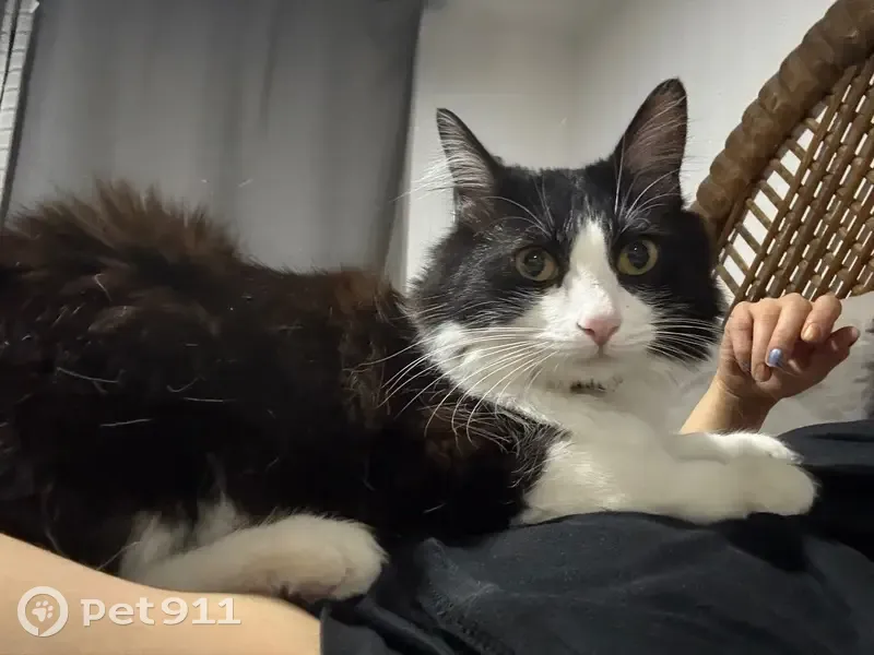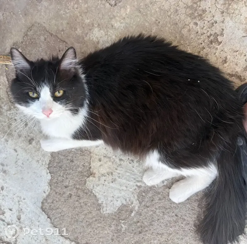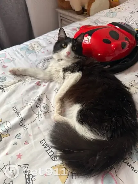 Blanco y negro, pelo largo , salimos unos días de vacaciones y al parecer ya no regresó a casa ya que las croquetas estaban poco bajas de consumo (tenemos otra gatita pequeña que aquí sigue). Trae su collar negro con rosa con huellitas y un cascabel.