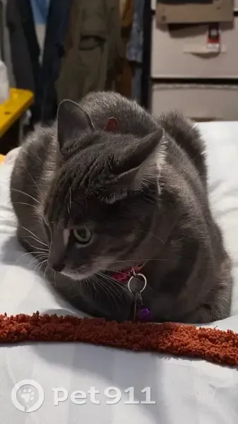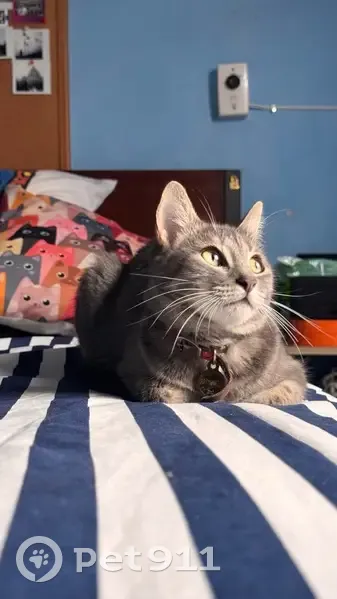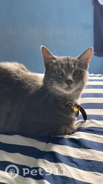 Gris con rallas blancas en el estómago, es hembra, es pequeña, cara pequeña, trae un collar rojo con bordado y tiene un dije que dice FRIDA y detrás un número telefónico.