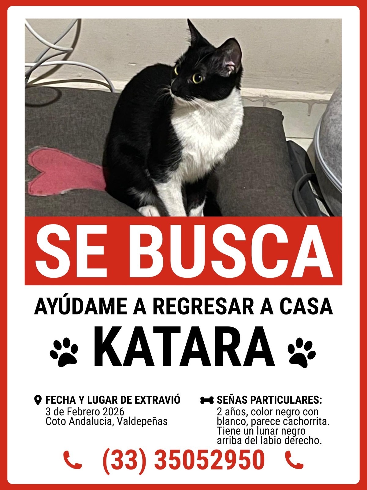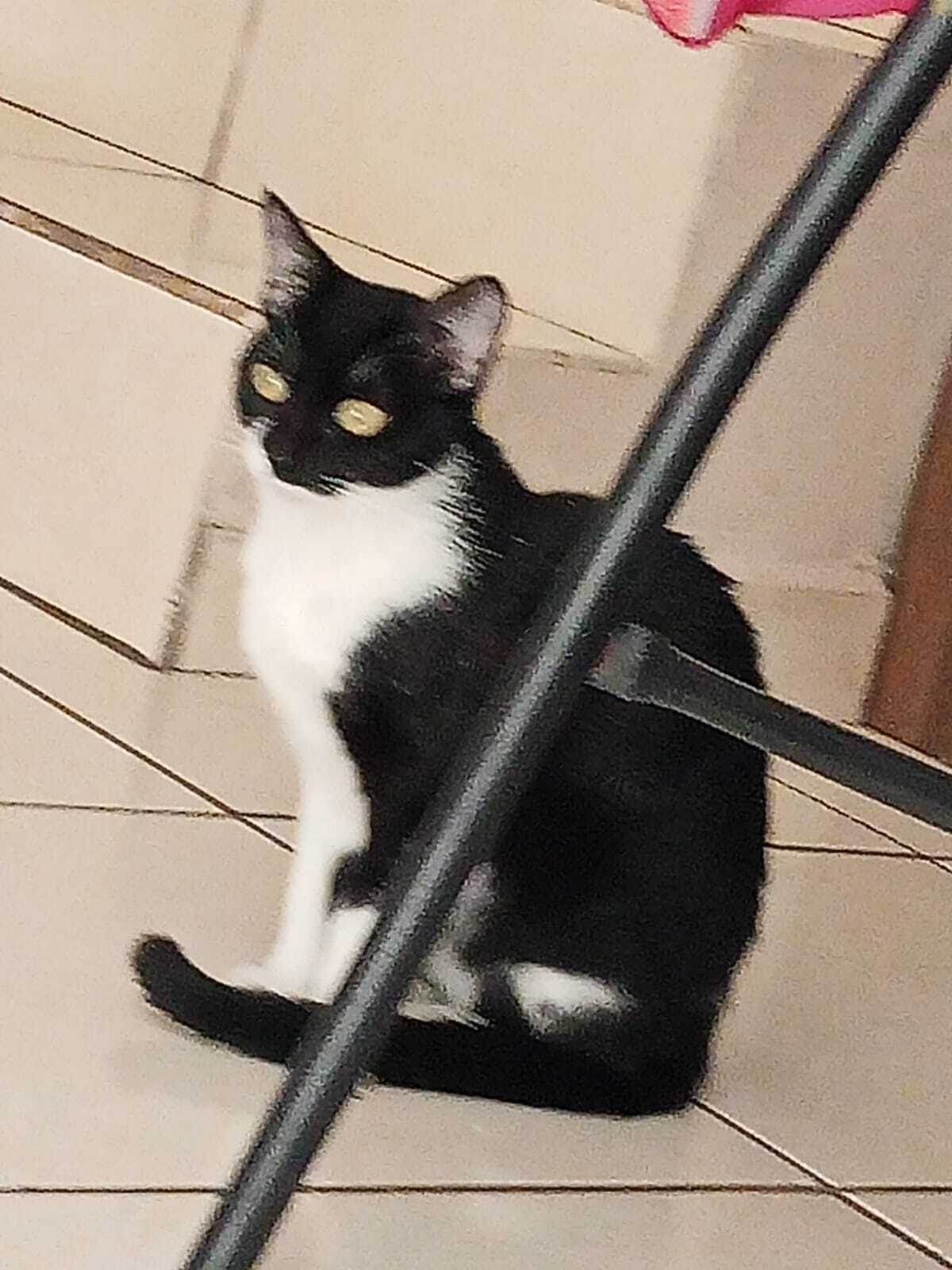 Es una gata chaparrita, parece cachorra. Es negra con el pecho y las patas blancas. Con un lunar negro arriba del labio, de la parte derecha. Es muy asustadiza.
